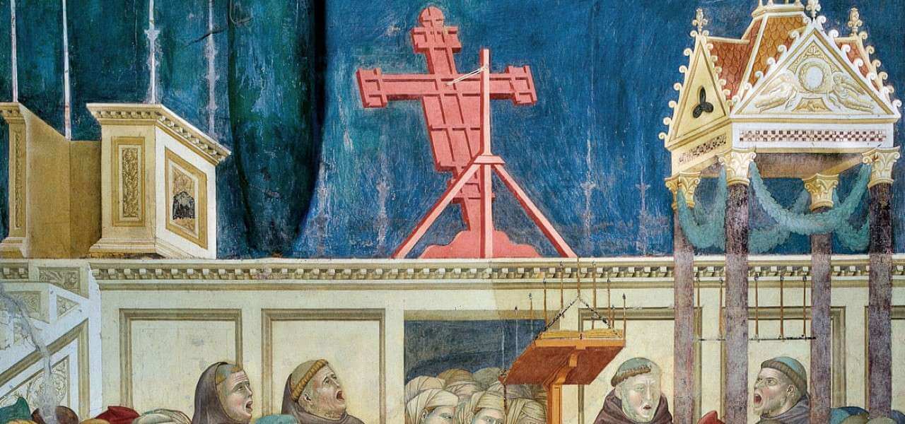 Ma torniamo alla croce di spalle del Presepe di Greccio. La vediamo stagliarsi contro la volta azzurra della chiesa, che doveva essere di un blu ben più intenso di quel che vediamo oggi. È anche in posizione inclinata, e Giotto ci mostra dettagliatamente il dispositivo che la sorregge. Non è l’unico caso, perché anche in un’altra scena del ciclo di Assisi, quella dell’“Accertamento delle Stimmate”, Giotto mostra una croce dipinta, appoggiata su una trave, inclinata verso gli astanti. Questo movimento della croce che viene incontro ai fedeli è qualcosa che, a pensarci bene, colpisce. La croce si piega verso di noi, in una dinamica che è di donazione, e forse anche di protezione: dall’altra parte, quella dipinta che non vediamo, infatti c’è Gesù che ci si avvicina, che vuole dimostrare che la sua sofferenza è amore per noi.