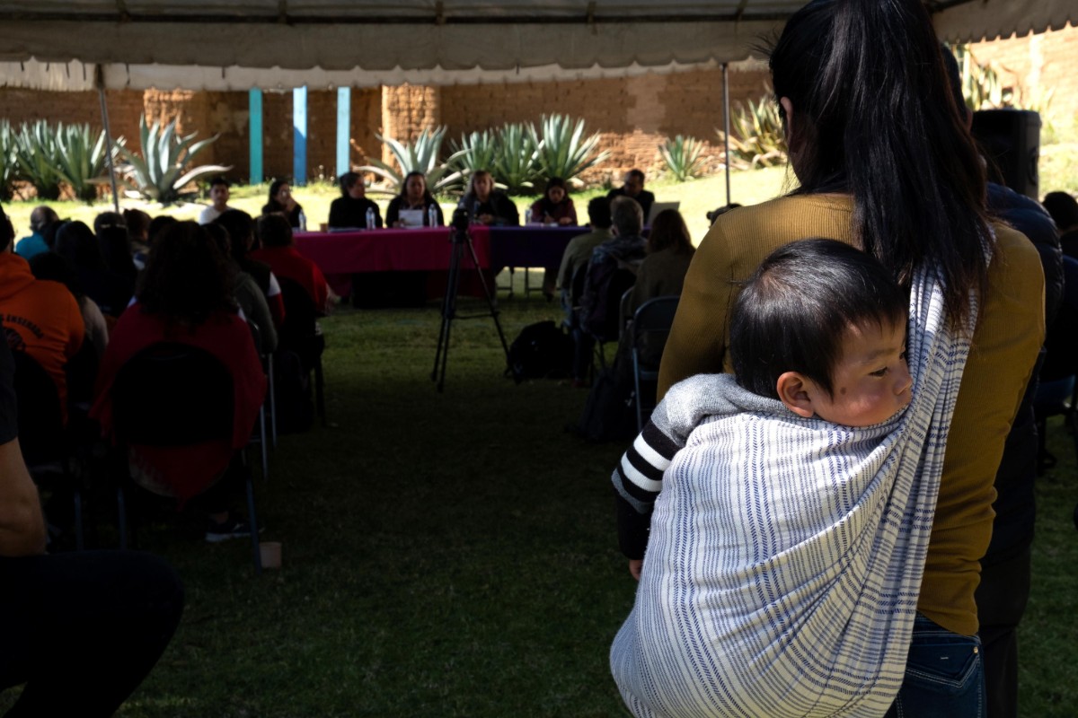 Il bambino dorme appoggiato sulla schiena della madre, cui è legato tramite una fascia, mentre il sacerdote celebra la Messa di San Giovanni Battista in lingua tzotzil, preservata grazie all’impegno dei domenicani spagnoli del XVI secolo. La madre prega, seduta per terra, molto attenta, con gli occhi fissi su una pala d’altare barocca con santi dai tratti nativi americani, incorniciati da luci colorate simili a quelle usate sugli alberi di Natale.