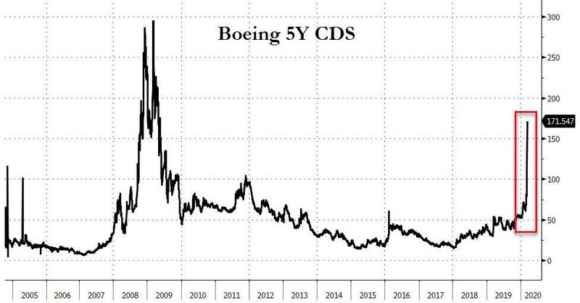 E attenzione, perché a detta del capo analista Spencer Cutter, un prolungato periodo di stress come quello attuale potrebbe far precipitare in quelle condizioni ulteriori 320 miliardi di dollari in controvalore di debito che oggi a malapena mantiene standard compatibili con l’ultimo livello dell’investment grade. Una cascata di default, un disastro sul rischio di controparte. Non vi basta. Sapete perché Donald Trump, nell’arco di 24 ore è passato dal ritenere il Covid-19 poco più di un raffreddore alla necessità di parlare alla nazione con tono da chiamata alle armi, soprattutto imponendo lo stop per 30 giorni ai collegamenti aerei con l’Europa, mossa che ha schiantato i titoli delle compagnie del Vecchio Continente? Ce lo spiega questo ultimo grafico, il quale rappresenta la reazione del mercato all’ultima, disperata mossa messa in campo da Boeing per cercare di non fallire. Mossa resa nota da Bloomberg poche ore prima che il Commander-in-chief parlasse alla nazione dalla Casa Bianca: la compagnia statunitense, già in crisi strutturale dopo i disastri legati ai software di volo, ha infatti operato quello che in gergo viene definito drawdown delle sue linee di credito revolver. Detta in parole povere, a fronte di 13,825 miliardi di dollari in linee di credito ottenuti da Boeing da un pool di banche dopo la crisi legata agli incidenti, l’azienda ha deciso che entro oggi sposterà tutto quel denaro dai conti degli istituti ai propri. Insomma, Boeing vuole che il denaro sia nel suo stato patrimoniale, a disposizione diretta e immediata.