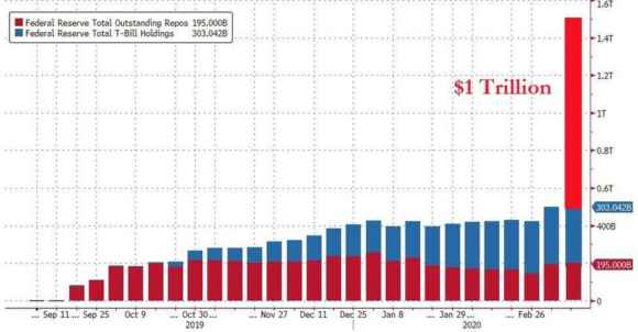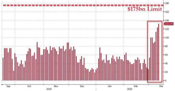 Ecco quindi che, come mostra questo altro grafico, la Fed ha immediatamente alzato a 175 miliardi la disponibilità massima delle aste repo overnight, le stesse che a detta di Jerome Powell e soci sarebbero dovute concludersi a novembre dello scorso anno, essendo di fatto legate unicamente a “temporanee necessità rispetto agli obblighi del terzo trimestre”. I banchieri centrali sono tutti uguali, a Washington come a Francoforte. L’aumento è divenuto immediatamente operativo da ieri, quando la Fed di New York ha dovuto iniettare nel sistema – fra term e repo – altri 198 miliardi di dollari, solo per garantire la liquidità necessaria affinché Wall Street potesse aprire le contrattazioni, dopo due blocchi per eccesso di ribasso nel pre-market! E nonostante questo, pochi minuti dopo la campanella il trading è stato sospeso per eccesso di ribasso!