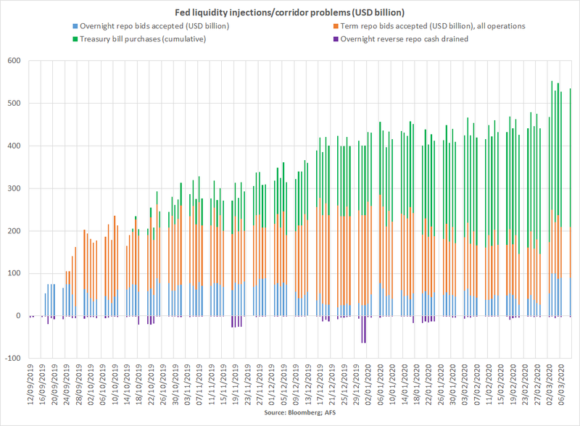 E la questione, già grave in sé, assume profili ulteriormente drammatici, se a questa fretta di intervento si uniscono altre due considerazioni. Primo, soltanto il 10 marzo la stessa Federal Reserve aveva già innalzato nottetempo e alla chetichella quel limite da 100 a 150 miliardi di dollari. Secondo, come mostra questo grafico, da settembre a oggi la Banca centrale Usa ha iniettato nel sistema finanziario qualcosa come 550 miliardi di dollari sotto varie forme (repo, term, acquisti di Treasuries), ma, stando agli ultimi dati ufficiali, le riserve in eccesso equivalgono solo alla metà di quell’ammontare. Dov’è finito il denaro, lo stesso che oggi il mercato invoca a gran voce, pena schianti degli indici continui? Cosa sta accadendo, anzi cosa è già accaduto e ora forse sta arrivando al redde rationem finale, sotto il pelo dell’acqua della finanza globale?