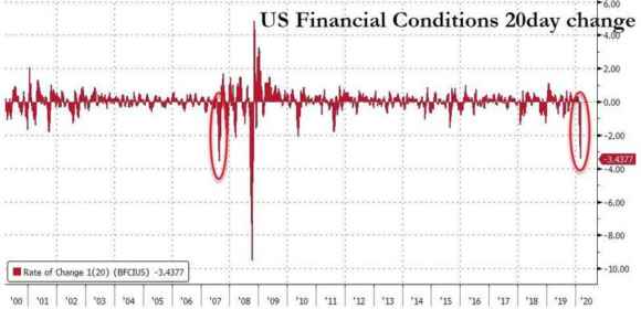Perché lo ha fatto, però? Cos’è emerso dal sottosuolo della finanza di tanto grave da spingere Jerome Powell a muoversi? I cali degli indici? No. Qualcosa di molto più serio e sistemico. Come mostra questo grafico, le dinamiche di credito e finanziamento attraverso il loro proxy dello stress finanziario del sistema Usa inviavano segnali da pre-Lehman e un chiaro avviso alla Banca centrale: una devastante crisi di liquidità, una cronica mancanza di dollari che lubrifichino i meccanismi della Macchina, sta per colpire. Adesso. Subito.
