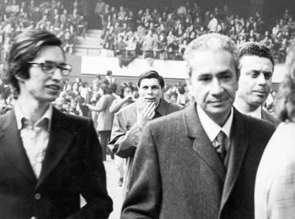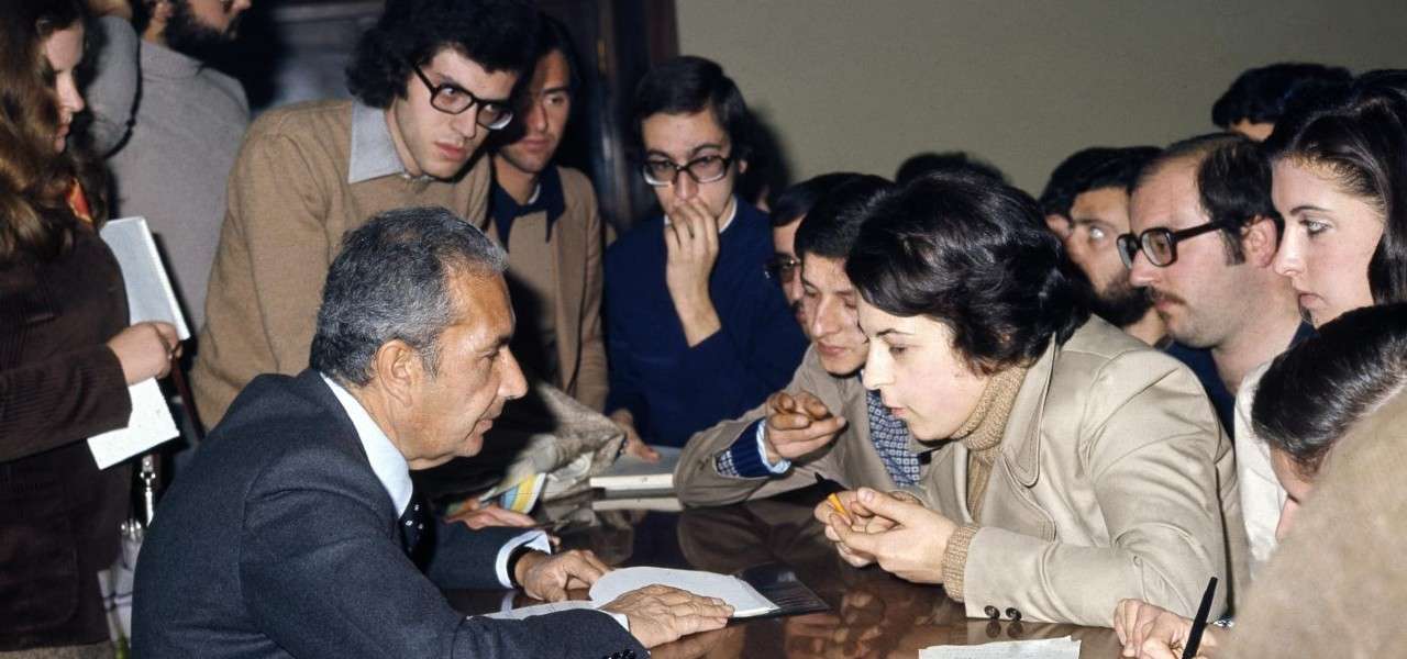 Aldo Moro (1916-1978) all'università con alcuni studenti (LaPresse)