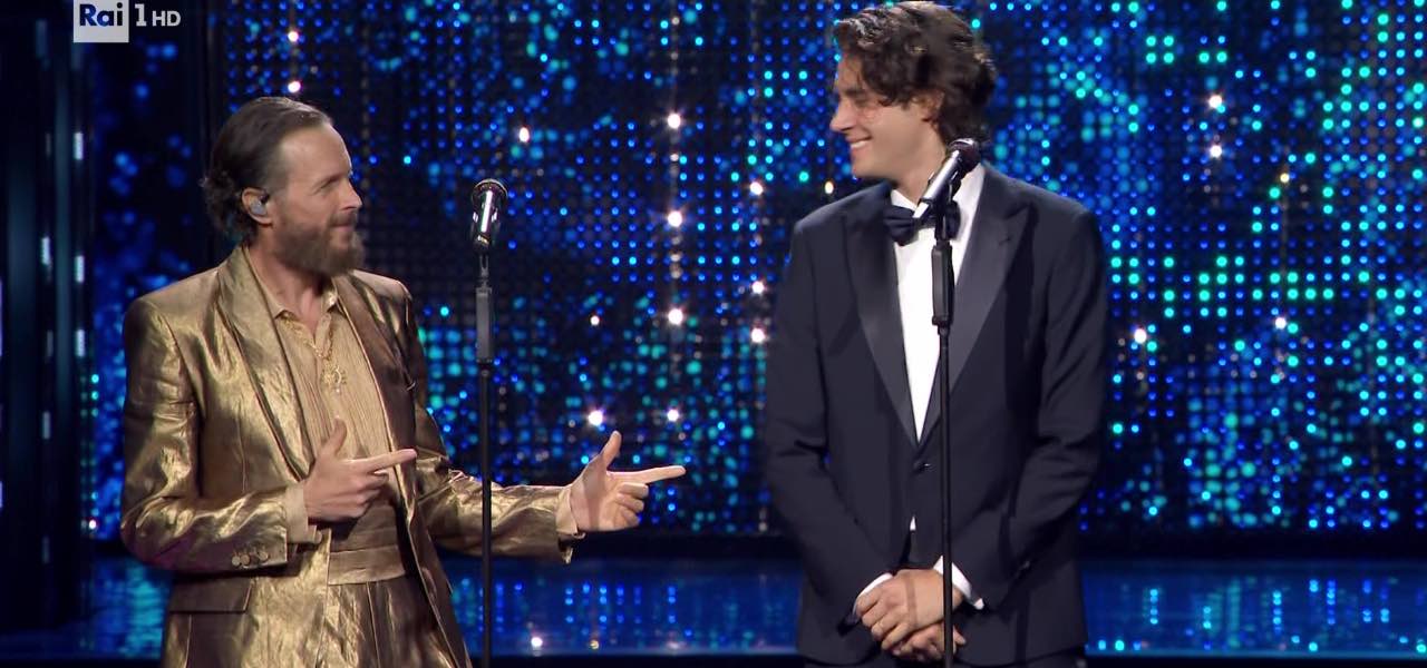 Uno smoking d’oro con camicia appunto in tinta e un ciondolo a forma di sole che gli cade sul petto, con scarpe glitterate e un fiocco nero sopra. Travolgente nelle movenze (anche se ha rischiato di cadere) e nel look Jovanotti. Decisamente più classico ed elegante Gianmarco Tamberi, che ha “duettato” con il cantante per leggere un messaggio importante. Uno smoking semplice, ma appunto elegante, anche se il papillon è apparso oversize. (agg. di Silvana Palazzo)