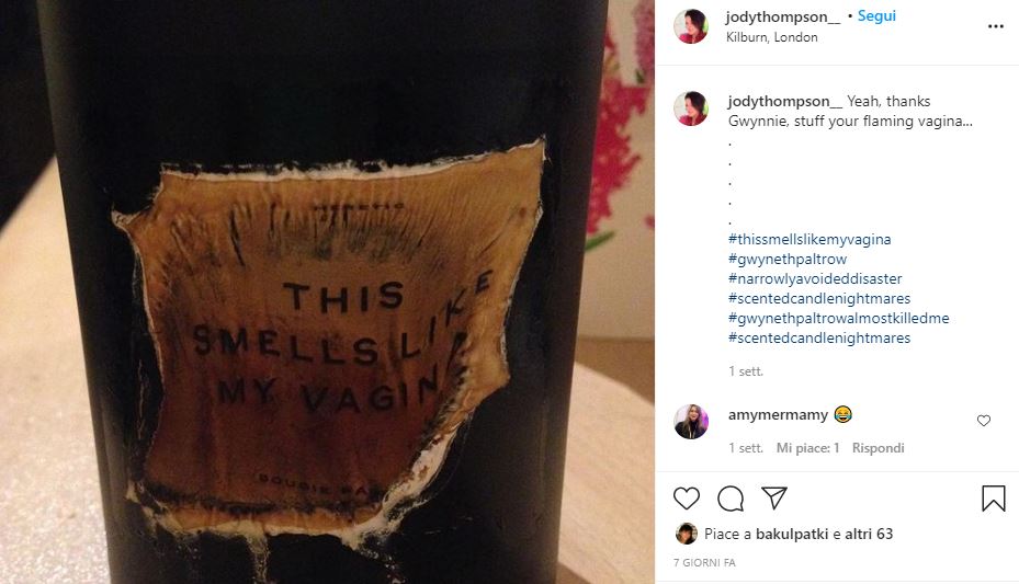 A quel punto si scatenò l’inferno: “Pochi minuti dopo aver acceso la candela, è esplosa. Le fiamme sono divampate per mezzo metro dal barattolo e frammenti di cera fusa sono volati fuori mentre sfrigolava e sputava. Non potevamo avvicinarci per spegnerla perché le fiamme erano così feroci e non volevamo gettare acqua su di essa per paura di schizzare cera fusa ovunque. Per fortuna l’avevo appoggiata sul cemento, alla base di quello che una volta era un caminetto”. Fortunatamente il rogo è durato all’incirca cinque minuti: “Le fiamme si sono placate e ho potuto spegnere la candela. Il barattolo carbonizzato e l’etichetta fusa testimoniavano quanto fosse diventato caldo”, ‘cimelio’ che la stessa Jody Thompson pubblicò poi su Instagram proprio a testimonianza dell’accaduto, e che attirò l’attenzione di numerose testate giornalistiche: dal Sun al Mail, passando per il Mirror e arrivando oltre oceano fino al New York Post. “Alla fine della giornata – racconta ancora – la storia era apparsa su siti di notizie in Nuova Zelanda, Brasile, Canada, India, Indonesia e Filippine” e noi ci aggiungiamo l’Italia. La Thompson ha concluso descrivendo la sua esperienza con tali parole: “L’odore acre della candela alla vagina che esplode della Paltrow non è qualcosa che mi piacerebbe rivivere, ma ne sto ancora ridendo”.