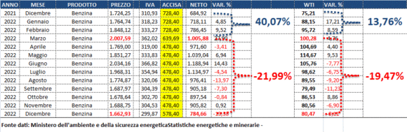 Nello stesso arco temporale, la stessa dinamica è stata vissuta dai prezzi della benzina: rispetto ai due euro al litro di marzo 2022, l’ultima rilevazione media dello scorso dicembre vede un valore complessivo a quota 1,662. Da questa oggettiva comparazione risulta evidente come l’ammontare delle flessioni registrate da entrambi siano pressoché allineate, ma, in capo al prezzo della benzina, è doveroso sottolineare come le accise presenti in quello specifico arco temporale siano state però oggetto di riduzione (portate a 0,478 rispetto ai precedenti 0,728 euro).