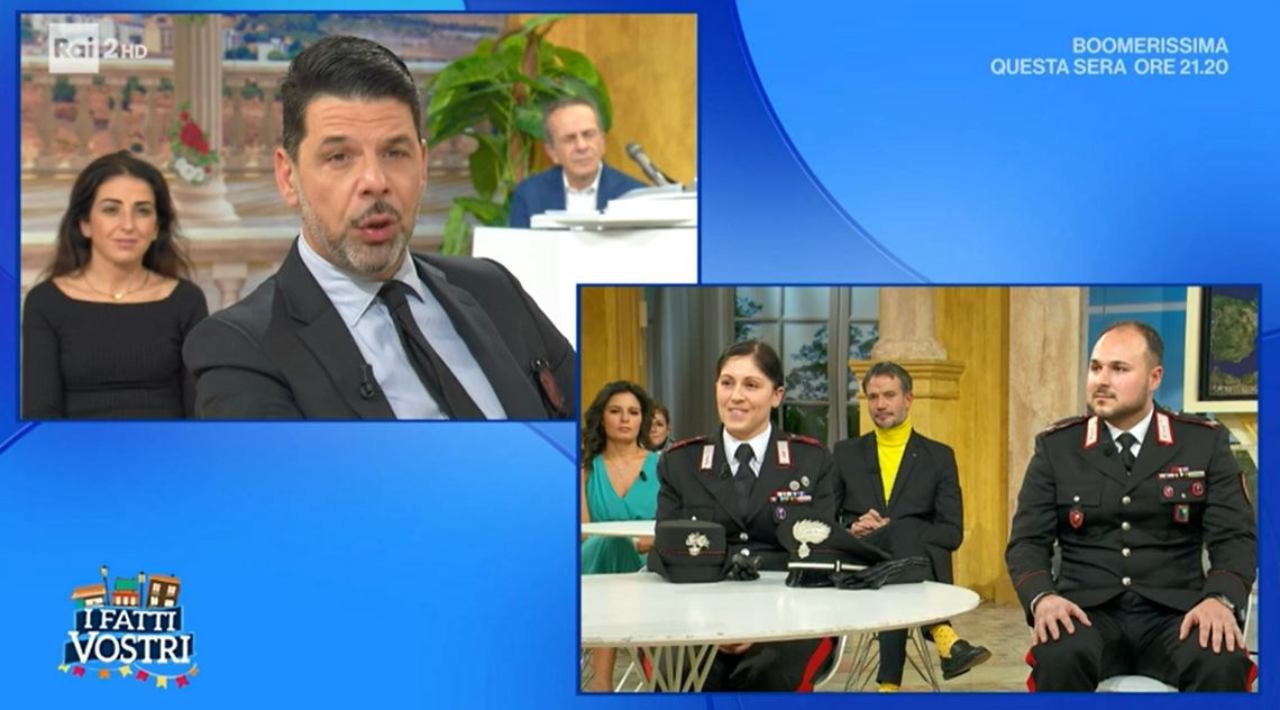 I carabinieri Filippo Consi e Ncoletta Piccoli intervistati stamane dal programma di Rai Due, I Fatti Vostri: pochi giorni fa hanno arrestato il 24enne che accoltellò una israeliana a Termini
