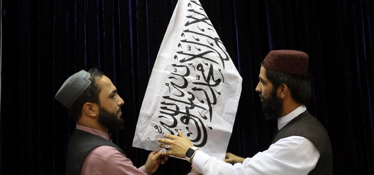 Kabul: la bandiera dei talebani esposta durante la conferenza stampa (LaPresse)
