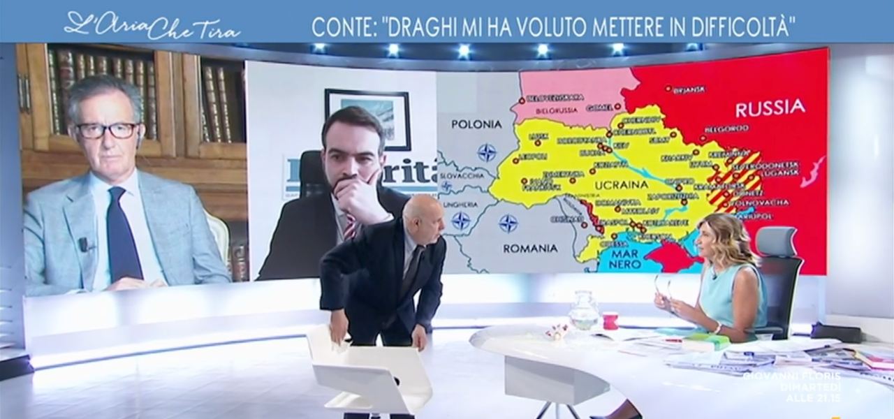 Video show di Alan Friedman che pulisce la sedia dove era seduto poco prima Giuseppe Conte a "L'Aria che Tira": "come Berlusconi con Travaglio? Io sono igienico”