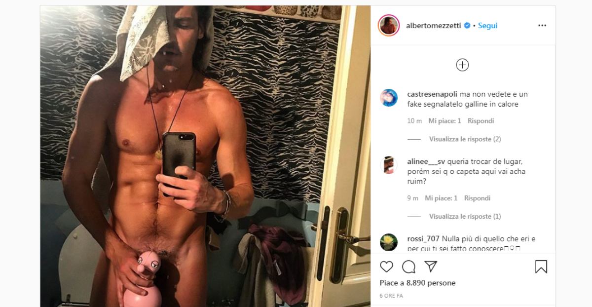 E’ un Alberto Mezzetti in versione decisamente piccante quello che si è mostrato la scorsa notte sulla propria pagina Instagram. Attraverso il proprio profilo social, l’ex vincitore del Grande Fratello, conosciuto dai più come il Tarzan di Viterbo, ha pubblicato uno scatto in cui si è praticamente mostrato come mamma l’ha fatto: in bagno, con un asciugamano in testa, lo smartphone in una mano per farsi la foto, e nell’altra, un oggetto indefinito (sembrerebbe un piccolo birillo del bowling di colore rosa con la testa a forma di paperella), a coprire le parti intime. Colpo di testa causato dalla quarantena? Chi lo sa, fatto che sta che lo scatto in questione è stato particolarmente apprezzato dai suoi follower, visto che, nel giro di qualche ora, si è portato a casa più di 9000 mi piace, un numero di tutto rispetto. Mezzetti non ha postato alcuna didascalia a corredo della foto, ma a ravvivare la discussione ci hanno pensato i suoi seguaci, che hanno pubblicato diversi commenti, chi di approvazione, chi invece, come spesso e volentieri accade in questi casi, di indignazione.