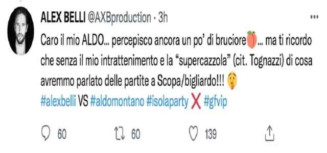 La replica di Alex Belli è arrivata puntuale attraverso un tweet. “Caro il mio Aldo Montano. Percepisco ancora un po’ di bruciore… ma ti ricordo che senza il mio intrattenimento e la “superca***la” (cit. Tognazzi) di cosa avremmo parlato delle partite a biliardo?”.