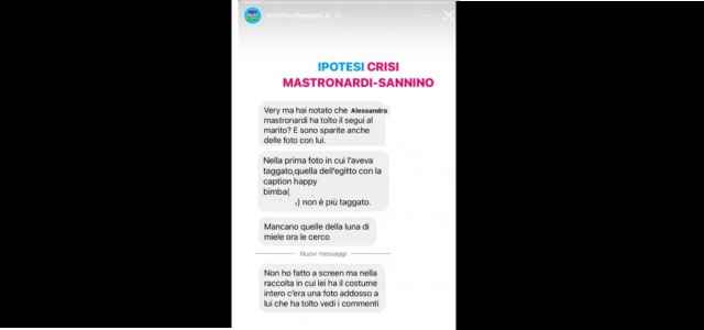 Stando all’indiscrezione riportata da Very Inutl People, Alessandra Mastronardi avrebbe smesso di seguire il marito su Instagram e sarebbe sparito anche il tag dalle foto di coppia che l’attrice aveva pubblicato nell’ultimo periodo. “Very hai notato il segui al marito? E sono sparite anche delle foto con lui. Nella prima foto in cui l’aveva taggato, quella dell’Egitto con la caption ‘happy bimba’ non è più taggato. Non ho fatto screen, ma nella raccolta in cui lei ha il costume intero c’era una foto addosso a lui che ha tolto. Vedi i commenti”, è il messaggio ricevuto e pubblicato da Very Inutil People.