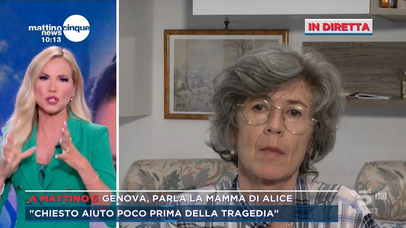 Lunga intervista della signora Antonella, la mamma di Alice Scagni, a Mattino 5. La ragazza venne uccisa lo scorso maggio a Genova dal fratello Alberto, persona mentalmente instabile, una tragedia annunciata da tempo secondo la madre della vittima. A Mattino 5 viene mandata in onda una telefonata che la donna ha commentato così: “Ci focalizziamo sulla seconda chiamata che è quella che io ho registrato ma è conseguenza di un’altra chiamata che Alberto aveva fatto precedentemente e nella quale avevo detto a suo padre ti taglio gola, pancia e ammazzo tutti”.