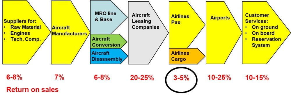L’immagine sottostante riporta le redditività medie storiche dei diversi segmenti industriali che compongono la catena del trasporto aereo nel mondo.