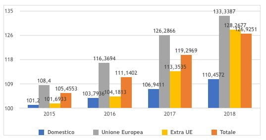 Se guardiamo ai numeri degli ultimi anni, rappresentati nel grafico 1, da quando sono scomparsi gli effetti della lunga recessione economica sul mercato italiano i risultati conseguiti sono notevoli: nel quadriennio compreso tra il 2014 e il 2018 il mercato complessivo è cresciuto del 27%, corrispondente a un 6,1% medio annuo. Al suo interno i passeggeri sui voli domestici sono aumentati del 10% (2,5% medio annuo), quelli intra Ue del 33% (7,5% annuo) e quelli extra Ue del 28% (6,4% annuo nel quadriennio che sale tuttavia all’incredibile 11% nel biennio più recente).
