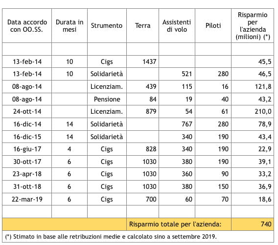 Nella Tabella seguente sono riportati, grazie alle informazioni gentilmente messe a disposizione dal sindacato CUB, i numerosi accordi che si sono succeduti dal 2014 con le organizzazioni sindacali, il numero dei lavoratori interessati e la quantificazione del risparmio sul costo del lavoro che essi hanno reso possibile. Tali accordi hanno comportato l’uscita anticipata di oltre 1.700 persone, in gran parte a seguito di licenziamento, e l’utilizzo di ammortizzatori quali la Cigs e la solidarietà per poco meno di 83mila mesi uomo complessivi, corrispondenti a poco meno di settemila anni uomo. Dunque nel periodo esaminato, in cui il mercato aereo è cresciuto di quasi un terzo, Alitalia ha operato mediamente con tremila persone in meno tra quelle attive all’inizio del 2014, comprensive delle 1.700 prima ricordate e di altre 1.300 mediamente in cassa integrazione in ogni periodo. Non poche se si considera che all’inizio del 2014 i dipendenti totali, tra tempo pieno e parziale, erano solo di poco superiori ai 13 mila.