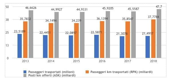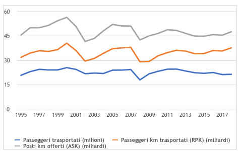 Per quanto riguarda invece la domanda essa è normalmente rappresentata dal numero dei passeggeri, tuttavia la variabile preferibile è data dai passeggeri km, al fine di tener conto della differente lunghezza dei viaggi. Le tre variabili chiave dei passeggeri trasportati, dei passeggeri km e dei posti km offerti sono riportate nel grafico 2 per il periodo 1995-2018.