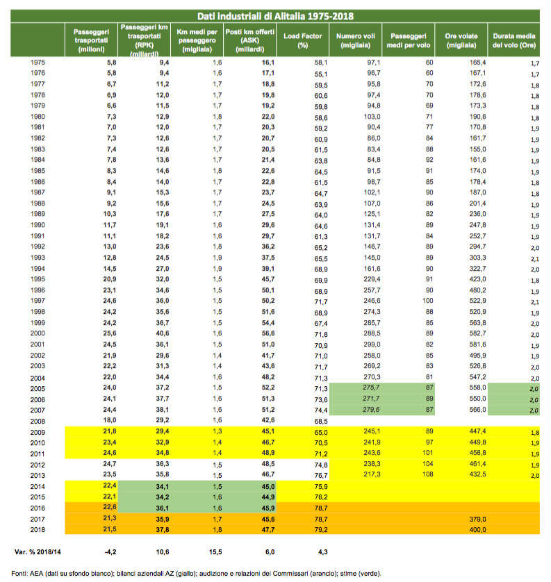 Tutti i dati raccolti sono stati ordinati nella Tabella qui scaricabile. Il database parte dal 1975, ma assume interesse solo dal 1995, anno in cui Alitalia assorbe il vettore regionale controllato ATI e assume le dimensioni e caratteristiche con cui siamo stati abituati a conoscerla. I dati su sfondo bianco sono quelli di fonte AEA, l’Association of European Airlines, disciolta alcuni anni fa, alla quale i vettori aderenti trasmettevano ogni mese i dati industriali. I dati su sfondo giallo sono tratti dai bilanci aziendali di Alitalia, mentre quelli su sfondo arancio da documenti della gestione commissariale pubblicati sul sito. I dati su sfondo verde sono invece stimati. Se assenti è perché non è stato possibile reperirli, né stimarli sulla base di assunzioni ragionevoli.