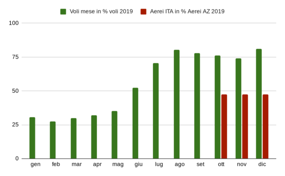Faccio un esempio iniziale con dati del tutto ipotetici, poi andiamo a vedere quelli effettivi: se in gennaio, per via del lockdown, la domanda è al 20% dei livelli pre-Covid e poi cresce linearmente sino a raggiungere l’80% in dicembre, il dato in media d’anno sarà proprio il 50% previsto dalla Iata. Ma ITA che debutta verso la fine dell’anno è opportuno che parta al 50% oppure all’80% della flotta della vecchia Alitalia ante-Covid? Se parte al 50% e il mercato è all’80% sta regalando quasi il 40% della sua quota di mercato ai concorrenti, i temibili low cost i quali ringraziano e subito si impossessano.