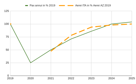 Prima di rispondere alla domanda è opportuno prevenire il lettore riguardo a un possibile abbaglio statistico: le previsioni Iata sono valori in media d’anno, comprendono tutti i mesi da gennaio a dicembre. Invece la scelta di ITA di partire con 52 aerei è puntuale e si riferisce alla data del suo debutto. Quindi i due dati non sono correttamente confrontabili. Il confronto corretto è invece quello con l’andamento del mercato nel momento specifico, non con un dato medio su 12 mesi estremamente differenti per restrizioni Covid ed effetti della pandemia.