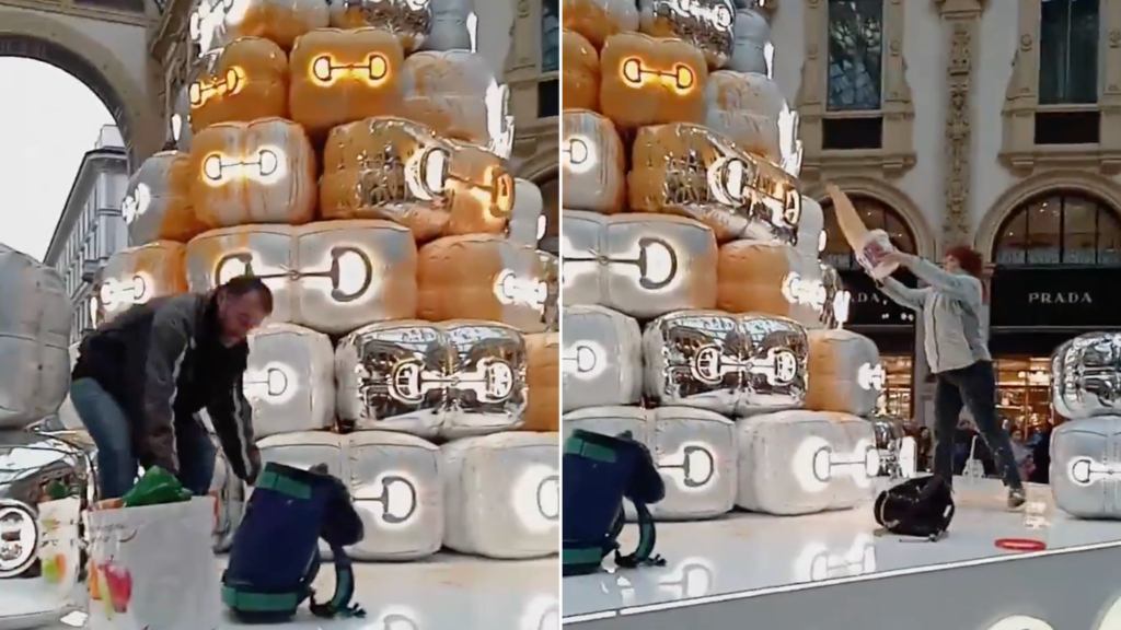 Nella mattinata di oggi, 29 dicembre 2023, un nuovo blitz degli ambientalisti si è registrato in quel di Milano: nel mirino il tanto chiacchierato albero di Natale di Gucci posto all’interno della Galleria Vittorio Emanuele, composto da una serie di borse messe a mo’ di piramide. Dopo averlo colorato di arancione si sono anche “incollati” le mani a terra, un gesto spesso e volentieri ripetuto dagli attivisti per il clima di Ultima Generazione.