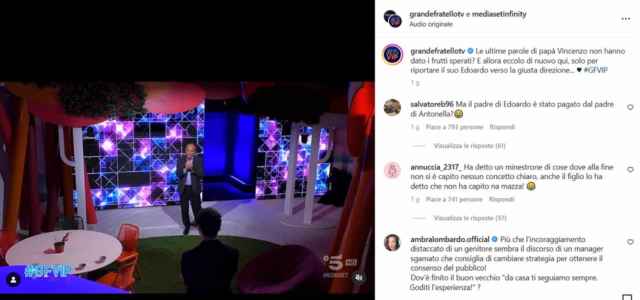 Il padre di Edoardo ha così svelato di aver mostrato al figlio un biglietto con il numero 43 ovvero la percentuale dei voti ricevuti durante un televoto in cui erano coinvolti altri quattro concorrenti. L’atteggiamento del padre di Edoardo non è piaciuto a tutti e, tra i commenti sotto il video pubblicato dalla pagina Instagram del Grande Fratello, è spuntato anche quello di Ambra lombardo.