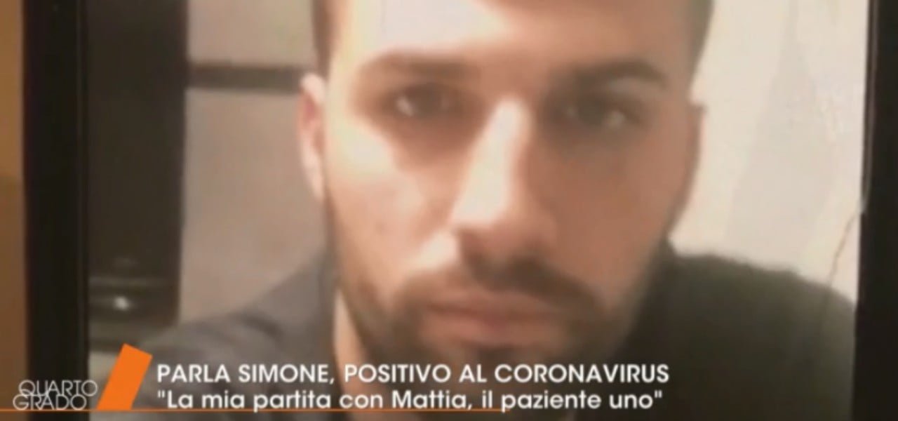 Positivo al coronavirus: la quarantena di Simone, cittadino di Casalpusterlengo, è stata raccontata in collegamento Skype nella puntata di ieri di Quarto Grado. Intervistato dal programma di Rete 4, il giovane ha raccontato di essere chiuso in casa da giovedì, quando ha scoperto che Mattia, suo compagno di calcetto, è stato confermato come caso di COVID-19. Non un caso come gli altri, a dirla tutta, si tratta infatti di Mattia, il 38enne definito “paziente uno”. Tutto è iniziato in maniera insospettabile: prima della partita di sabato mattina, infatti, Mattia non accusava nessun sintomo. L’amico ha raccontato: “Stava bene, scherzava con noi al pub. Poi dopo la partita, avrà giocato 10-15 minuti, quando siamo andati al pub per fare il nostro solito aperitivo post-partita ha chiesto un Oki perché aveva mal di testa. Da lì noi non abbiamo saputo più nulla. Poi giovedì alle 2 di notte un nostro amico è andato in ospedale perché la morosa si era tagliata facendo da mangiare ed è venuto fuori che Mattia era ricoverato”.