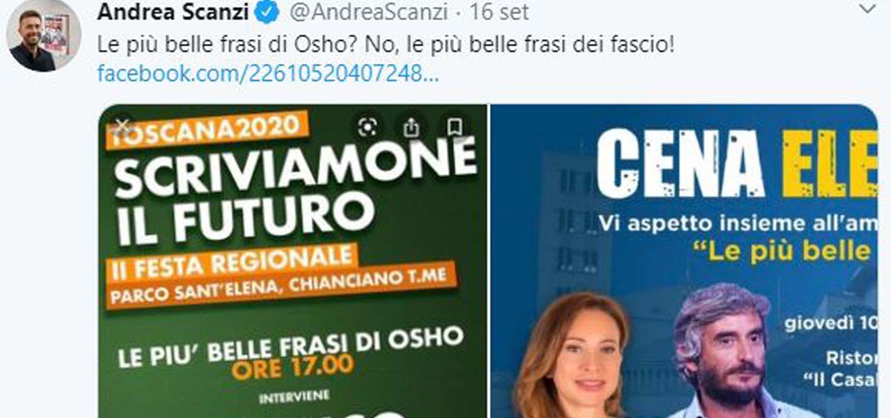Secondo Andrea Scanzi, Osho non solo non sarebbe un uomo libero, come da lui stesso sostenuto ma scriverebbe per Il Tempo, “il giornale più marginale e caricaturale nella galassia del sovranismo de noantri” e soprattutto “sta facendo campagna elettorale per Fratelli d’Italia in Toscana (e magari non solo in Toscana). Partecipa proprio a eventi e cene elettorali (vedi foto 2 e 3) per i post-fascisti”. Il giornalista infine conclude: “Questa non è satira: è propaganda para-fascista. Null’altro che Istituto Luce 2.0″. La replica di Osho chiaramente non si è fatto attendere. Federico Palmaroli sulla sua pagina Facebook ha replicato: “Il poveraccio mi ha bloccato quindi non posso rispondere sotto al suo post. Gli sarebbe bastato fare una ricerca più approfondita e avrebbe trovato anche locandine e foto di eventi targati PD, Arci, e (udite udite) 5 stelle (Campagna elettorale della Lombardi per la Regione Lazio e Italia a 5stelle a Napoli lo scorso anno). E sempre per fare un minispettacolino di satira e quasi sempre in amicizia”. Poi è andato giù pesante asserendo: “Povero buffone di regime, informati prima di sparare cazzate. Te lo dico io qual è il tuo problema (anzi, uno dei tanti): finché menavo duro sul PD e per questo venivo considerato filogrillino, te piacevo (nel corso di un programma mi facesti anche i complimenti), ora che al governo ci stanno i tuoi amici insieme ai tuoi ex nemici (e la satira, si sa, colpisce soprattutto il potere), te ce rode”.