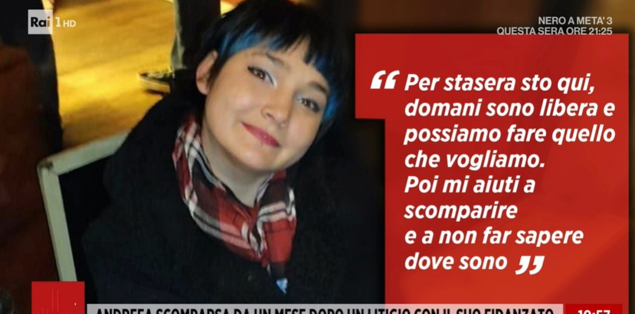 A “Storie Italiane”, trasmissione di Rai Uno, è stata trattata la vicenda legata ad Andreea Rabciuc, scomparsa da un mese dopo un litigio con il fidanzato, mentre i due si trovavano con una coppia di amici nelle campagne di Montecarotto (Ancona). Come ha riferito l’inviato Maurizio Licordari, “tutto si sarebbe svolto l’11 marzo all’interno di una roulotte. Quasi subito ci sarebbe stata una lite verbale senza interruzione con il fidanzato, protrattasi fino a notte fonda. La mattina alle 7, Andreea si sarebbe diretta verso la strada provinciale, poi di lei non si è più saputo nulla”.