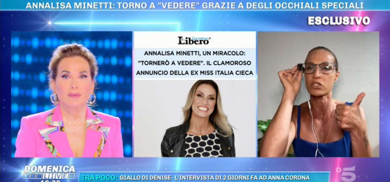 Annalisa Minetti è risultata positiva al Covid e purtroppo non è potuta venire in studio: “Sono positiva proprio di umore”, ha commentato in collegamento. “Non sono stata bene, adesso sto molto meglio, tutta la famiglia è stata colpita, anche i miei bimbi con febbre altissima, ma adesso stiamo tutti molto meglio e il Covid per noi è diventato come organizzare velocemente il domani”. Annalisa ha mostrato quindi gli occhiali presi in prestito dal marito e il dispositivo che le permetterà di “vedere”. La Minetti ha spiegato il funzionamento del dispositivo: “Mi dice tutto quello che la telecamera vede”, ha commentato, “usa come riferimento la punta del mio naso, la telecamera lo rileva e mi dice dopo due secondi quello che sto vedendo”.