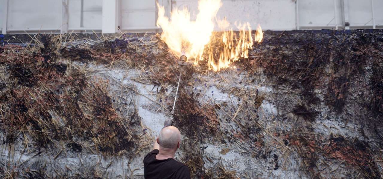 Ed è proprio la materia l’assoluta protagonista del lavoro di questo pittore tridimensionale. Ci sporchiamo le mani, con lui, affiancandolo nel processo creativo che è fatto di piombo fuso, fuoco dell’anima e fiamme invadenti, sparate sulla pittura, a bruciare di sofferenza la storia del mondo.