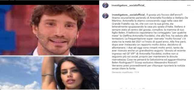 “Il gossip più focoso dell’anno?! Stiamo sicuramente parlando di Antonella Fiordelisi e Stefano De Martino. Il belloccio napoletano ha corteggiato “per qualche mese” la gieffina Antonella Fiordelisi, che alla fine, ha ceduto alle tentazioni. La frequentazione super riservata “molto focosa” c’è stata tra la metà del 2021 e l’inizio di quest’anno. – riporta Rosica sul suo profilo – Alla fine però, dopo aver instaurato un rapporto molto dolce, decidono di allontanarsi. I due ad oggi sono rimasti molto amici, tanto da aver ricevuto anche un grandissimo augurio “dovuto al recente ingresso nel Grande Fratello VIP” di Antonella Fiordelisi, inoltre non si seguono più sui social, proprio per mantenere la dovuta riservatezza”.