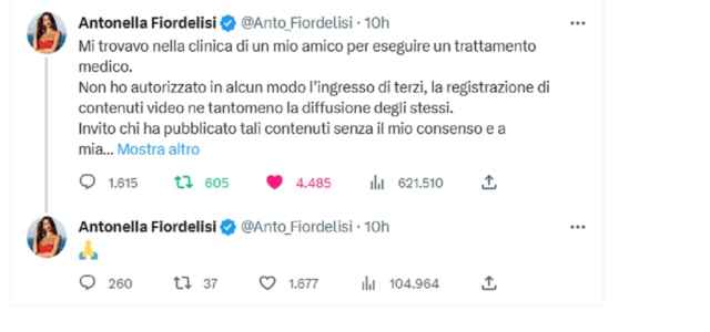 “Mi trovavo nella clinica di un mio amico per eseguire un trattamento medico. Non ho autorizzato in alcun modo l’ingresso di terzi, la registrazione di contenuti video ne tantomeno la diffusione degli stessi. Invito chi ha pubblicato tali contenuti senza il mio consenso e a mia insaputa a rimuoverli, chi si è reso responsabile di tali condotte ne risponderà nelle sedi più opportune“, ha scritto la Fiordelisi.