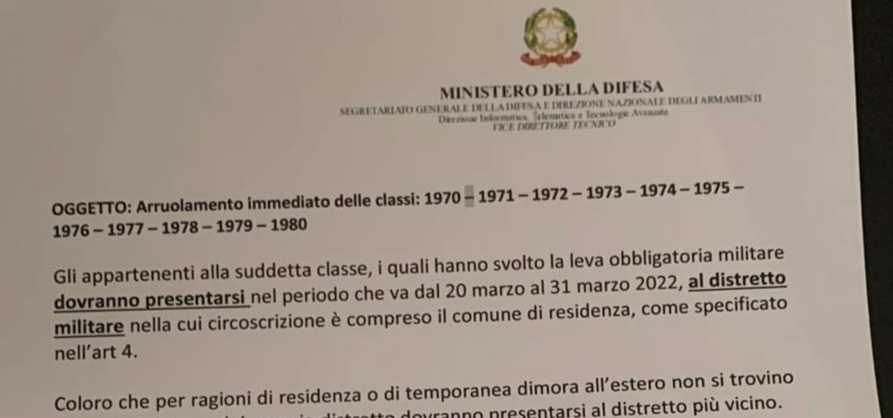La pseudo lettera, diventata virale soltanto sul web, che disponeva l’arruolamento immediato delle classi dal ’70 all’’80 per combattere la guerra in Ucraina, ovviamente, è una bufala. Il Ministero della Difesa non ha mai inviato il suddetto documento ai diretti interessati, che effettivamente sono stati gli ultimi ad avere svolto la leva obbligatoria, e per il momento non sembrerebbe essercene alcuna intenzione. Nonostante ciò, la notizia, diffusa sui social network e sulle piattaforme di messaggistica istantanea, ha creato non pochi allarmismi in Italia.