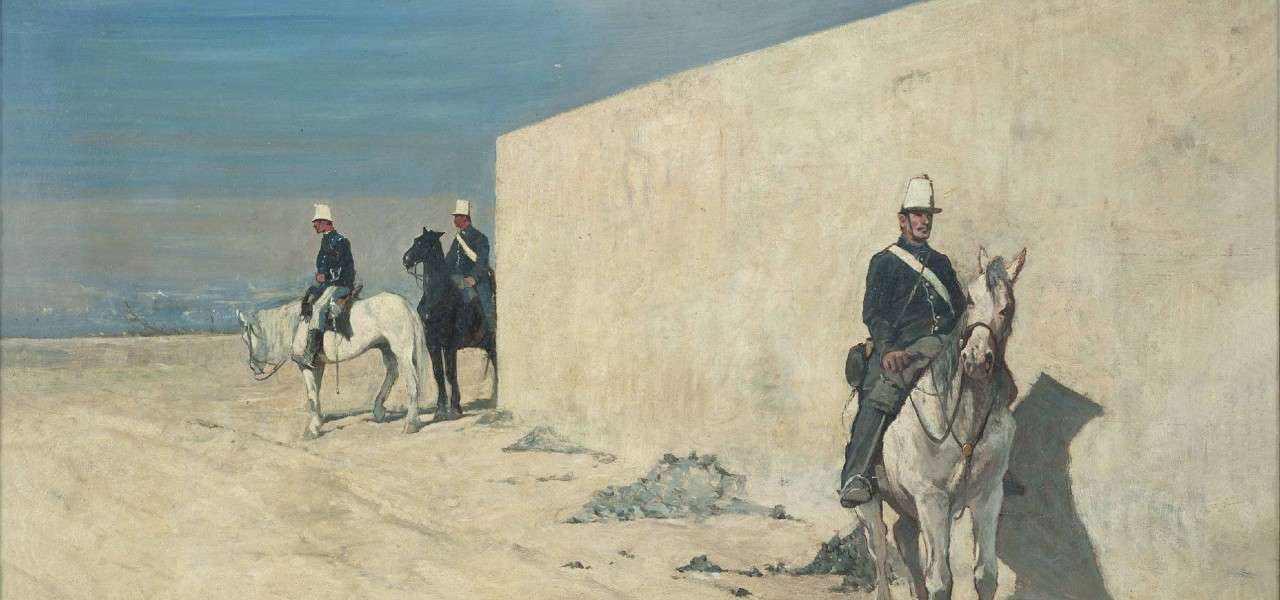 Emblematico quello che è riconosciuto come il suo capolavoro assoluto: In vedetta (Il muro bianco), del 1872. Raffigura, uniche presenze sulla scena, tre cavalleggeri in perlustrazione in un luogo arido e deserto, sotto un sole cocente, a simboleggiare la solitudine del soldato, sempre pronto a fronteggiare un pericolo imminente e invisibile. Fa riflettere quel muro che incombe, in un’epoca come la nostra dove avremmo dovuto abbattere muri ed erigere ponti. E invece i ponti si distruggono e siamo tornati a costruire muri.