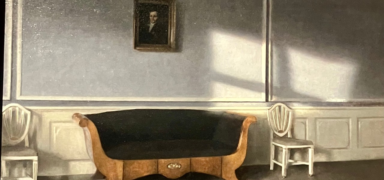 Di famiglia luterana alto-borghese e colta, il talentuoso Vilhelm ebbe un’ottima educazione artistica grazie alla madre, che riconobbe il suo precocissimo ingegno. Viaggiò molto, anche in Italia, e conobbe i pittori classici e i suoi contemporanei, ma il repertorio scelto dal riservatissimo Hammershøi è rimasto quello degli interni ordinati e disadorni, con rare figure dipinte per lo più di spalle, illuminate da una luce che filtra da finestre o porte che non si vedono o sono semichiuse, come nell’incantevole e insieme straniante Luce del sole nel salotto III.