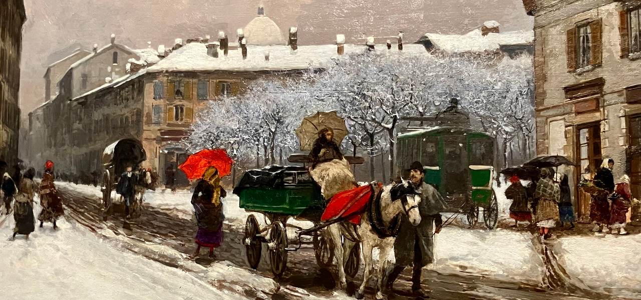 Ma ci sono anche scorci del tipico paesaggio urbano milanese, come nel limpido quadro Il Naviglio a ponte San Marco di Giovanni Segantini, con le signore eleganti munite di ombrellino da sole, ritratte dallo stesso autore anche in versione invernale in Nevicata, avvolte nell’umidità soffusa che i meneghini ben conoscono. Forse una certa nostalgia di neve verrà ai visitatori milanesi contemplando anche le tele “imbiancate” di Mosè Bianchi, Colonne di San Lorenzo e La prima neve, una vecchia Milano che sarà presto soppiantata dalle immagini della città moderna dei futuristi e di Sironi.