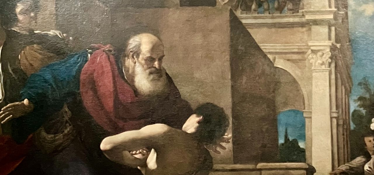 Basterebbe già solo ammirare uno dei suoi quadri più impressionanti, giustamente scelto come copertina del catalogo della mostra, Il ritorno del figliol prodigo del 1617, con quello sguardo severo e insieme di profondo amore del padre che accoglie il figlio pentito in ginocchio. Il gesto delle mani del genitore che accoglie con tremore anche tutto il peccato del ragazzo che si prostra ai suoi piedi; i colori intensi accompagnati dal chiaroscuro del corpo del giovane pentito con i piedi sudici in primo piano, segno del suo lungo cammino lontano “dalla retta via”, conferiscono alla tela una carica emotiva di grande coinvolgimento.
