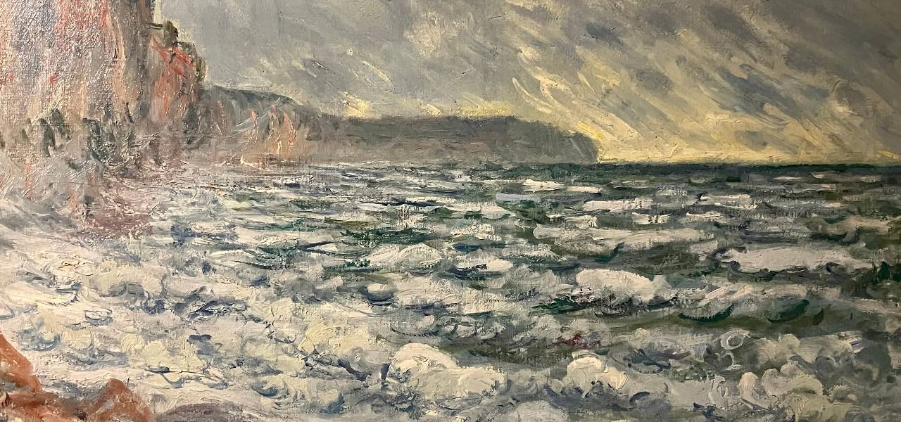 Già Corot nel 1855 annotava nei suoi taccuini che “la bellezza in arte è la verità, immersa nell’impressione”, come quella del paesaggio marino di Una spiaggia in Normandia, così rarefatto e insieme avvincente. Così la costa normanna, coi toni soffusi o tempestosi delle sue splendide vedute, diventa meta ideale per gli artisti, grazie a spiagge facilmente raggiungibili da Parigi, dove recarsi in treno o in nave portando con sé i nuovi colori a tubetto. Inventati nel 1841 da John Rand, si conservavano più a lungo, potevano creare inediti effetti di luce ed erano comodi nelle uscite en plein air. Anche i cavalletti portatili e i sedili pieghevoli erano strumenti di lavoro utili per il pittore “viaggiante”. Ci si poteva dirigere prima verso Argenteuil o direttamente al mare, anche in tempesta (Navi nella tempesta di Eugène Isabey), o sotto le scogliere rocciose a picco, come nel celebre Étretat, in cui Monet trova “i colori dell’aria, il segreto delle nebbie”. Nel suo Il mare a Fécamp poi, sembra che il pennello sotto l’effetto del vento prenda vita, disegnando vorticosi arabeschi, con i colori caldi delle scogliere che si dissolvono nella schiuma delle gelide acque della Manica.
