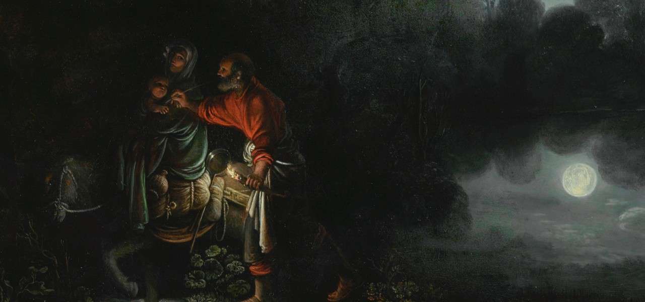 Nella "Fuga in Egitto" (1609) di Adam Elsheimer lo sguardo sorprende gli istanti della sacra famiglia alla luce della luna, certi della bontà di Dio