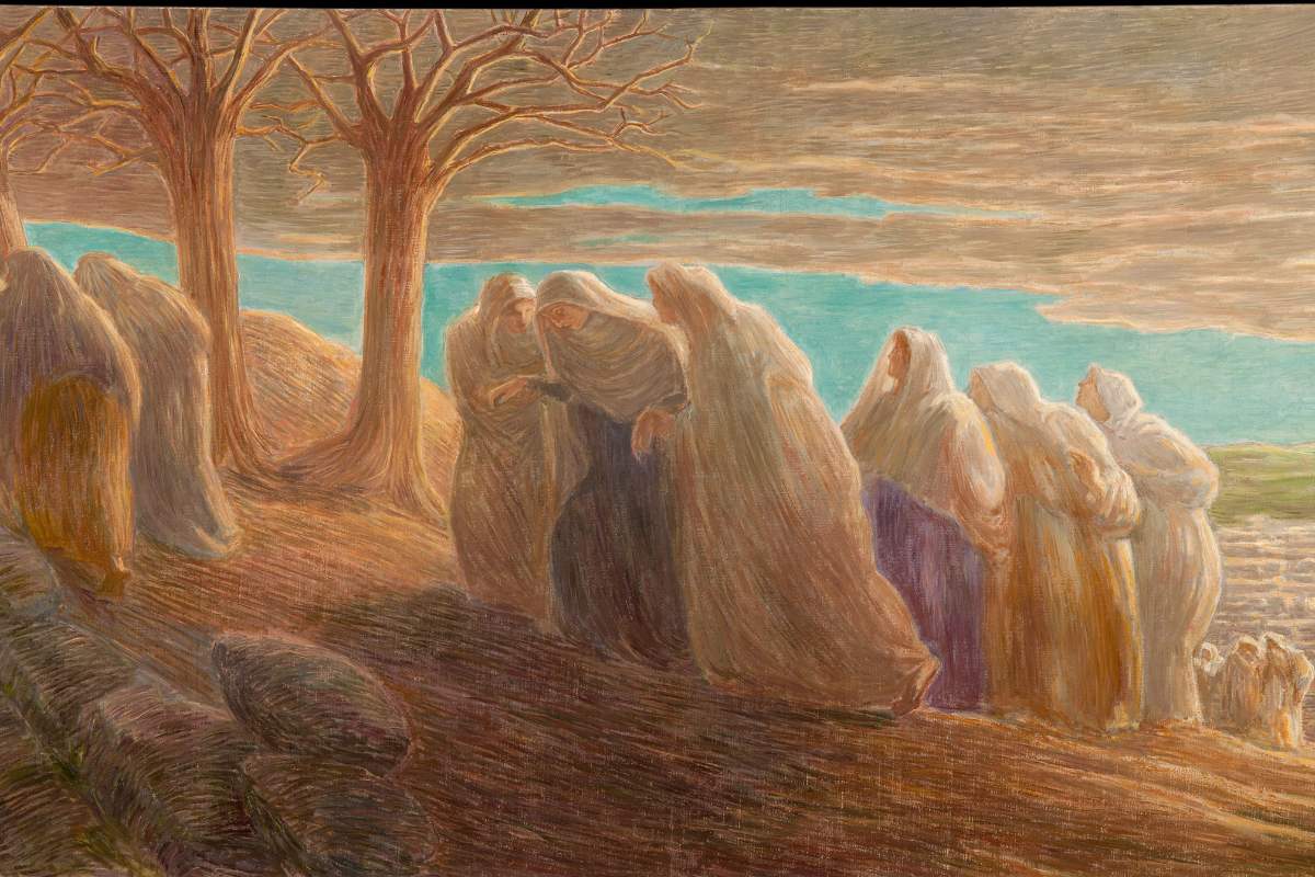 La tela, davvero imponente (80×150 cm), ritrae un corteo lento e silenzioso mentre si inerpica sulle pendici del Golgota. Ad animarlo sono numerose figure femminili che si coagulano intorno al pianto sofferto e vibrante della Madonna: sostenuta da ambo i lati, Maria procede sulla via dolorosa trascinando con sé sagome monumentali di donne oranti: ampie vesti e scialli vaporosi avvolgono di sobria eleganza i profili appesantiti di queste coraggiose israelite che, incuranti del pericolo, hanno scelto piuttosto di sfidarlo.