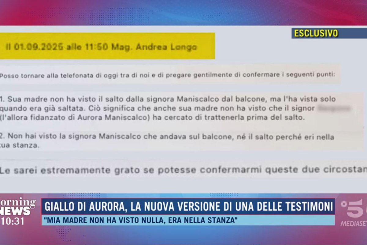Il talk di Canale 5 ha evidenziato come due testimoni, madre e figlia, che inizialmente avevano dichiarato di aver visto Aurora saltare dal balcone e cadere di testa, avrebbero successivamente ritrattato parlando con l’avvocato Longo, legale della famiglia Maniscalco in Austria.