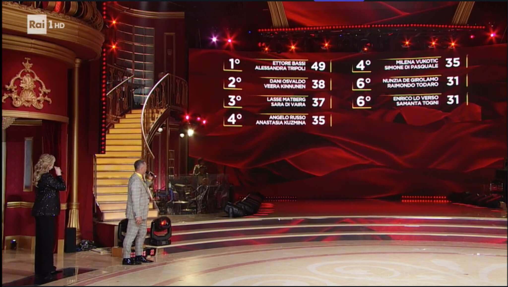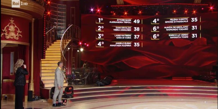 La classifica finale di Ballando con le stelle è così composta: dal basso, Enrico Lo Verso e Samanta Togni (40 punti), Dani Osvaldo e Veera Kinnunen (48 punti), Nunzia De Girolamo e Raimondo Todaro (49 punti), Lasse Matberg e Sara Di Vaira (62 punti), Milena Vukotic e Simone Di Pasquale (70 punti), Angelo Russo e Anastasia Kuzmina (70 punti), Ettore Bassi e Alessandra Tripoli (79 punti). Clamorosamente, Dani Osvaldo si ritrova a dover spareggiare. Il suo sfidante, come prevedibile, è l’ultimo classificato, ovvero l’highlander Enrico Lo Verso. Salvi Milena Vukotic, Angelo Russo, Ettore Bassi e Lasse Matberg. Lo Verso ha la fama di quello che si salva sempre in corner. Ci riuscirà anche questa volta? Era improbabile, e in effetti non ce la fa: è Dani Osvaldo a trionfare, con l’83% dei voti. (agg. di Rossella Pastore)
