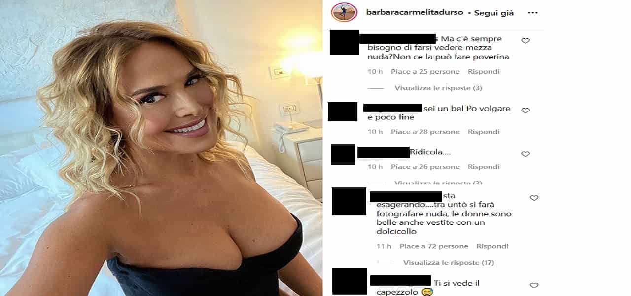 Barbara D’Urso regala un sorriso ai fans su Instagram pubblicando una foto in cui appare assolutamente perfetta con un vestito dalla profonda scollatura che evidenza la bellezza del suo decolletè. Una foto sensuale e che la conduttrice di Pomeriggio 5 ha regalato ai fans per ringraziarli dell’affetto che le dimostrano ogni giorno, ma non tutti sembrano aver apprezzato. Accanto ai like e ai complimenti, infatti, sono spuntate tantissime critiche da parte di haters che hanno attaccato la D’Urso di mettersi continuamente in mostra e di sfoggiare troppo la sua bellezza. C’è, infatti, chi pensa che, pur essendo una donna giovanile, non debba più pubblicare foto come quella che vedete all’inizio dell’articolo. “Ridicola” scrive in modo esagerato un hater. E altri aggiungono: “Ma c’è sempre bisogno di farsi vedere mezza nuda?“, “Ma perchè cadi nel ridicolo?, “Ma quando togli trucco e filtri? Sei una donna normale della tua età, impara ad accettarlo, così sei finta“. C’è anche chi sottolinea come la scollatura sia talmente profonda da mostrare i capezzoli. “Ti si vede il capezzolo”, aggiunge infatti un’altra utente.