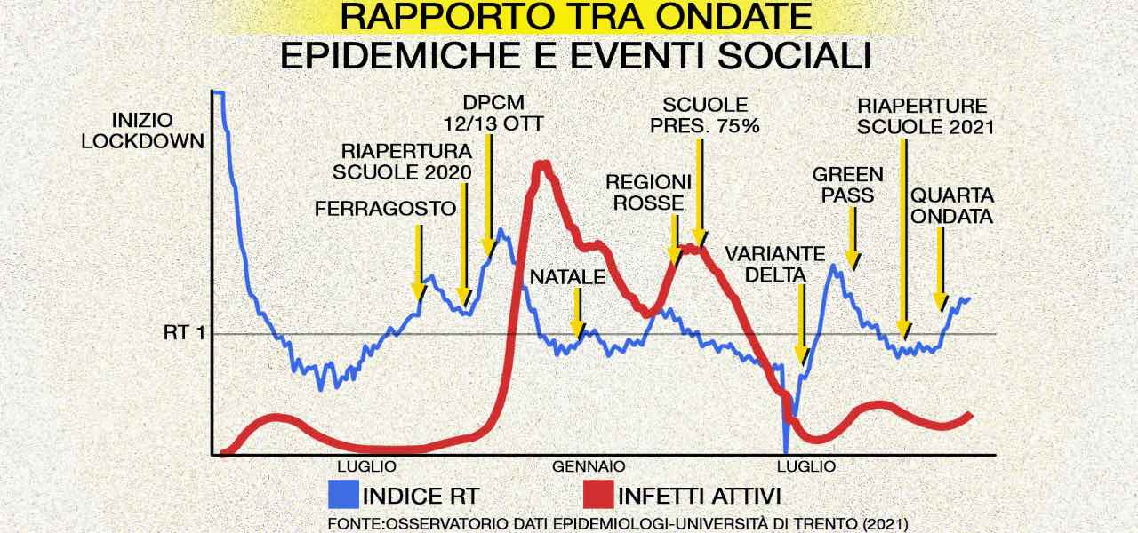 Siamo arrivati a Natale 2020, momento in cui la discesa si è fermata, «perché le zone rosse sono sparite, guarda caso l’indice Rt è salito e la curva degli infetti ha smesso di calare». Ora la situazione è diversa: «Quest’anno invece non c’è stata un’esplosione di casi, infatti la quarta ondata è cominciata a fine ottobre, questo per la campagna vaccinale e il Green pass che ha contenuto anche la terza ondata».