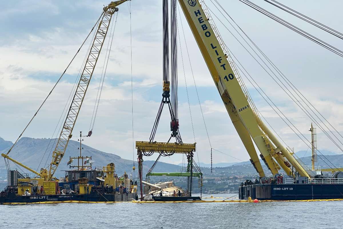 Il Bayesian è stato sollevato a galla dalle gru Hebo per consentire la messa in sicurezza delle imbracature (Foto 2025 ANSA NPK)