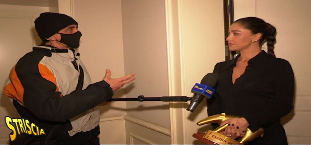 Valerio Staffelli non si è lasciato sfuggire l’occasione di ritornare dalla bella Belen. Così l’ha intercettata a Milano per consegnarle la famosa statuetta dorata e chiederle spiegazioni sull’accaduto. Belén ha dunque raccontato la sua versione dei fatti: “Sono andata lì per pranzo. – ha esordito la showgirl, per poi aggiungere – Ero seduta in una zona riservata e la mascherina l’ho tolta solo per mangiare e scattare qualche foto. Non ho visto la folla, perché sono andata via prima che la situazione degenerasse”, ha concluso poi l’argentina.