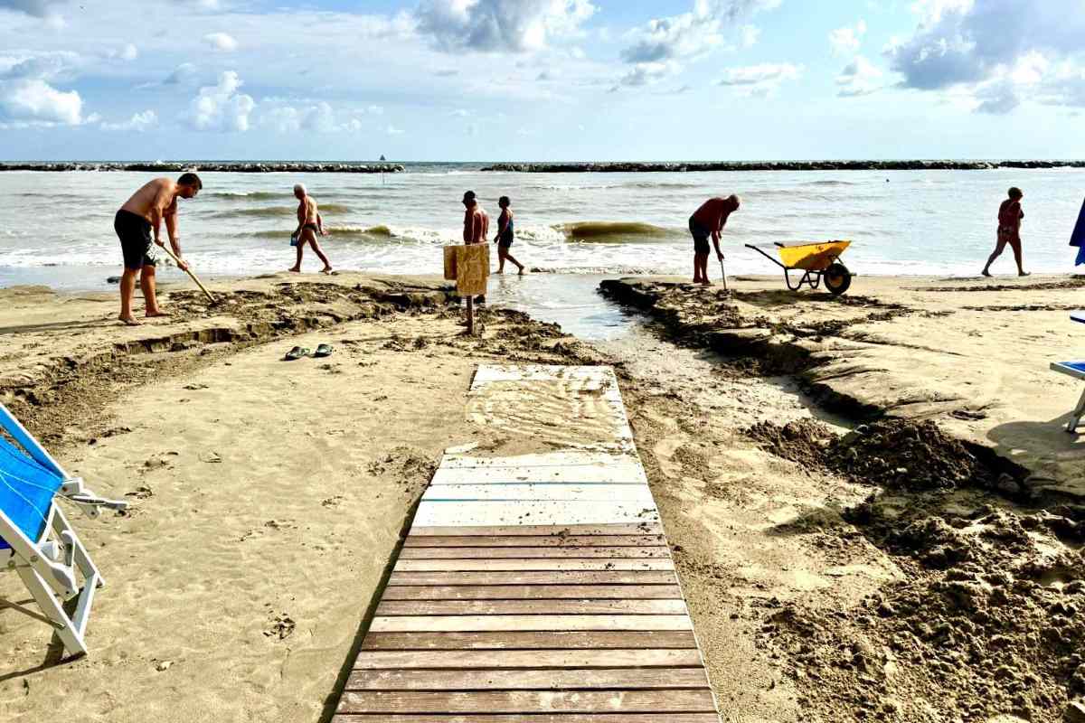 Raffiche di vento oltre i 100 km orari, alberi caduti, sottopassi allagati, dehor dei negozi travolti e spiagge funestate dal nubifragio che tra Rimini, Cervia e Ravenna si è riversato tanto nell’entroterra quanto a ridosso sul mare. Linee ferroviarie in tal, rete elettrica in generale in grossa difficoltà soprattutto tra Cesenatico e il Riminese, con ingenti danni segnalati dal Comune di Rimini per spiagge e bagni travolti dalla bomba d’acqua della notte. Solo nella “capitale” della Riviera romagnola si contano ben 5 sottopassi allagati e con oltre 75 millimetri di pioggia, ravvisa l’assessore alla Protezion Civile di Rimini Yuri Magrini.