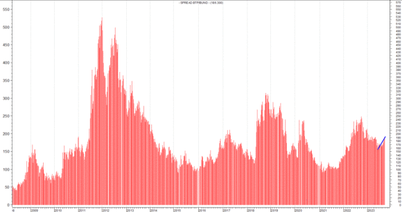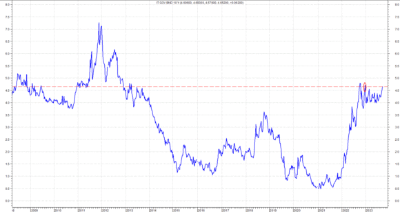 Ad esempio, guardando alle attuali remunerazioni dei titoli decennali italiani, il rendimento si posiziona a circa il 4,70% che, seppur elevato, riporta ai valori riscontrabili nell’ultima parte dello scorso anno. In tale circostanza, però, l’ammontare del famigerato spread era ben oltre i 200 punti e, a ottobre, aveva addirittura gravitato attorno a quota 250. Pertanto, semplicisticamente: nonostante l’uguaglianza di rendimento, “quello spread” registrava un ammontare assai diverso. Il motivo? Una banale e semplice motivazione unicamente riconducibile al minore rendimento del Bund tedesco che, un anno fa, di questi tempi, vedeva un ritorno in dote agli investitori di un “solo” 2,20%.