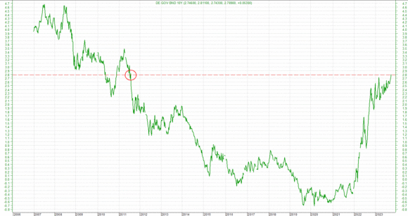Mancando la valorizzazione di questi depennati collocamenti, le casse della Germania, godranno sicuramente di un risparmio in conto capitale alla voce interessi: oggi, infatti, il livello raggiunto dal Bund decennale ha raggiunto quota 2,8% ovvero i valori del 2011. Una soglia che fa riflettere soprattutto perché direttamente correlata alla annosa tematica dello “spread” rispetto ai nostri Btp.